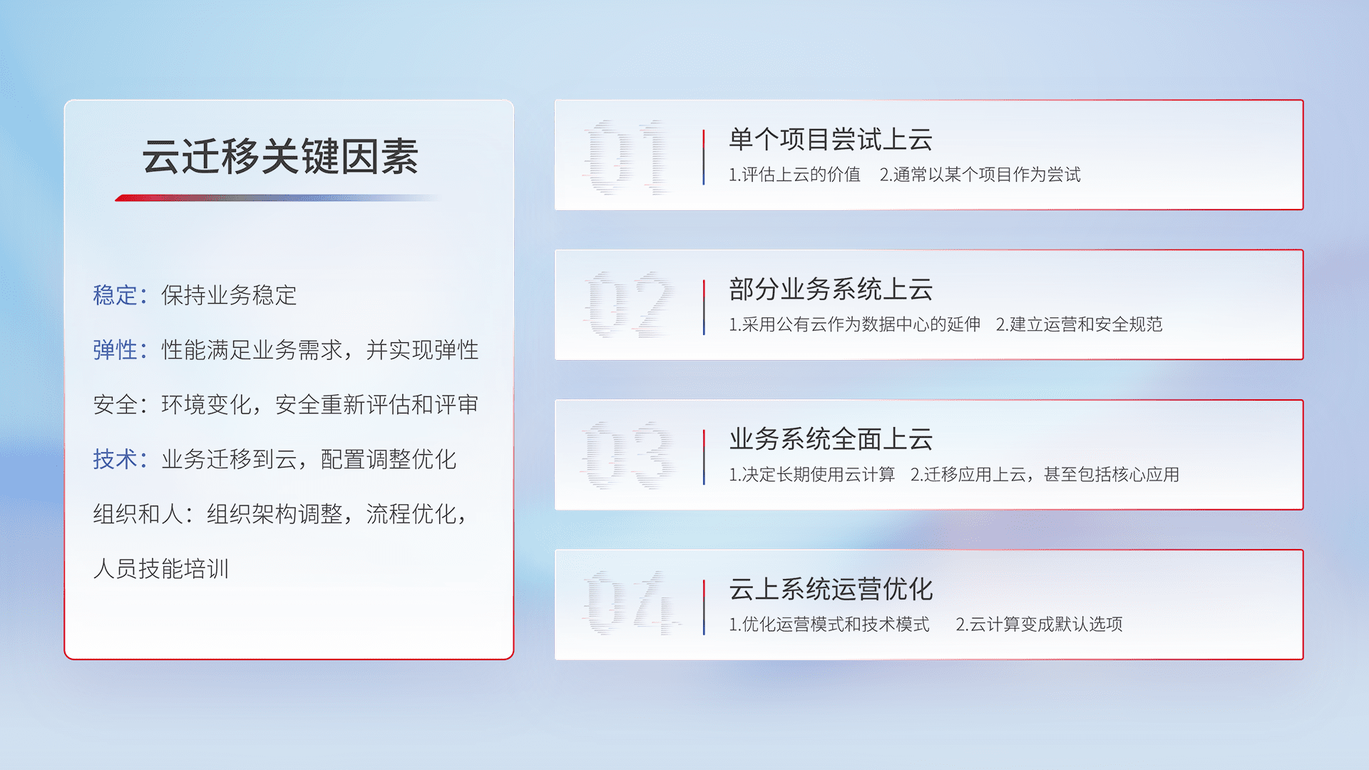 结合实际业务,,,从规划设计、、云平台选型、、、、云原生改造、、数据迁移、、、、集成交付,,,迁移全过程为客户识别最佳上云路径,,,,做好风险识别管理,,,设计网络架构、、、身份权限、、、安全审计合规、、操作审计、、、、日志审计、、、监控告警策略、、、多站点容灾设计等,,,,对云上基础设施进行整体规划,,提升IT治理水平,,以满足弹性、、、、高可用、、、高性能的需求。。